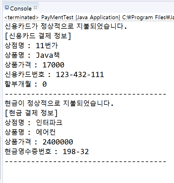 CashPayment cash1 = new CashPayment("인터파크","에어컨",2400000,"198-32");