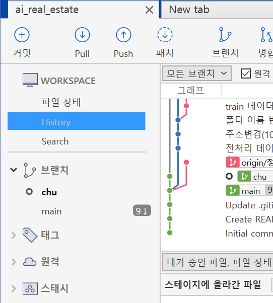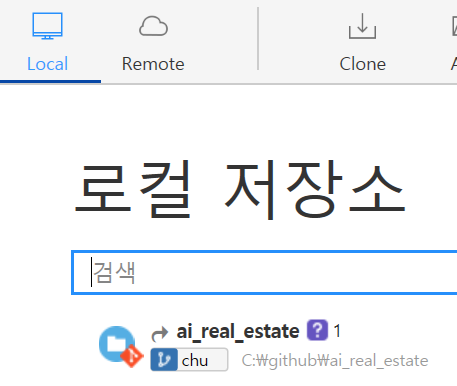 원격저장소를 연결해도 되지만 이번에는 로컬 저장소에 깃허브 연동된 브랜치를 만들어서 이용하였다