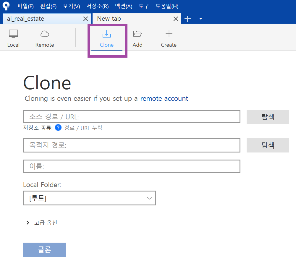 소스트리에서 Clone할 소스 경로에 붙여넣는다. 파일 경로도 설정해준다.