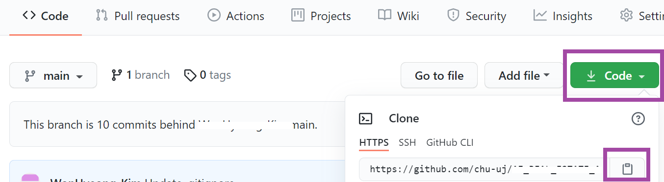깃헙에서 연동할 Repository 주소를 복사해온다